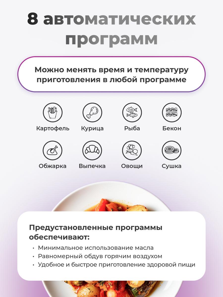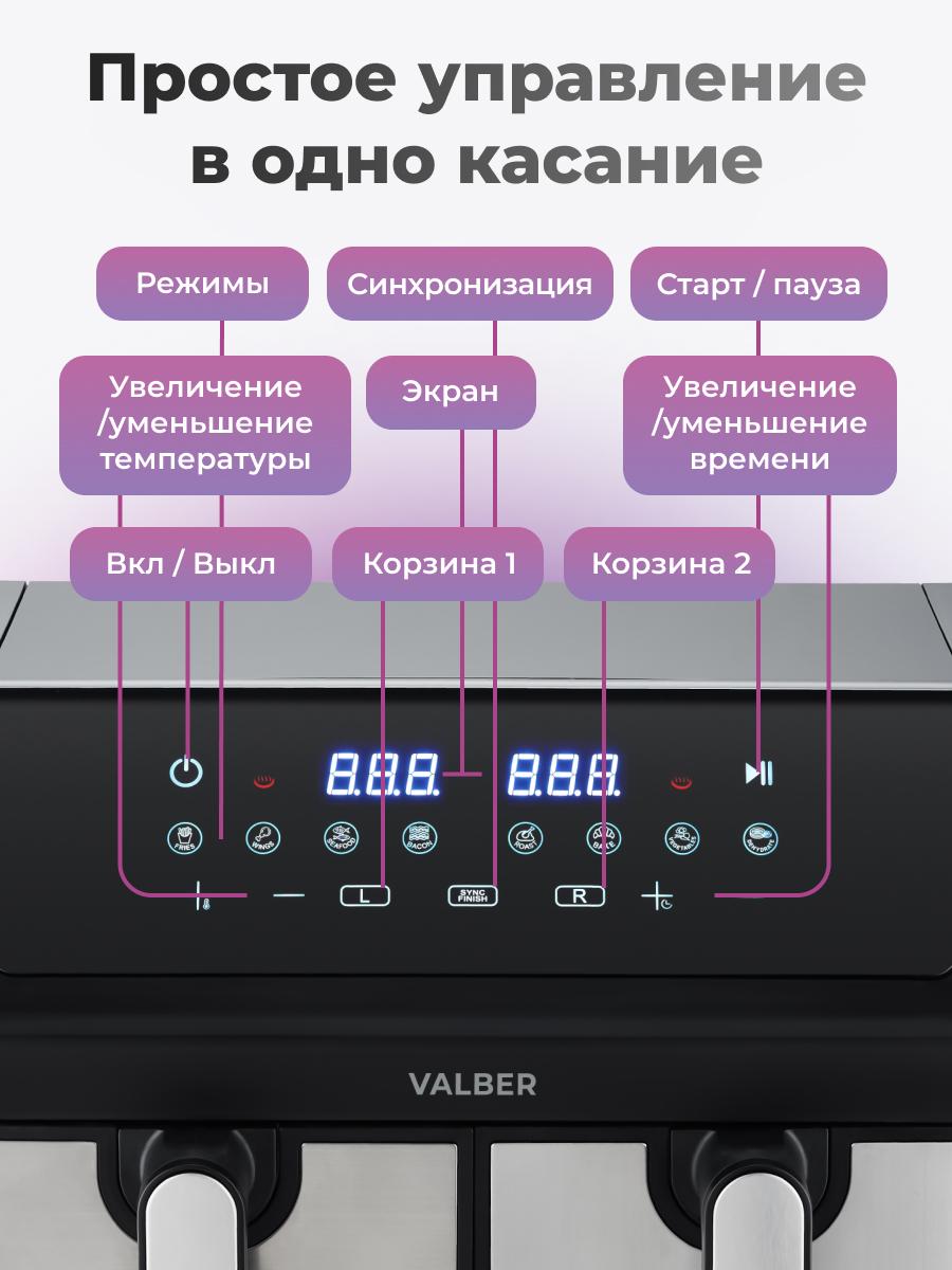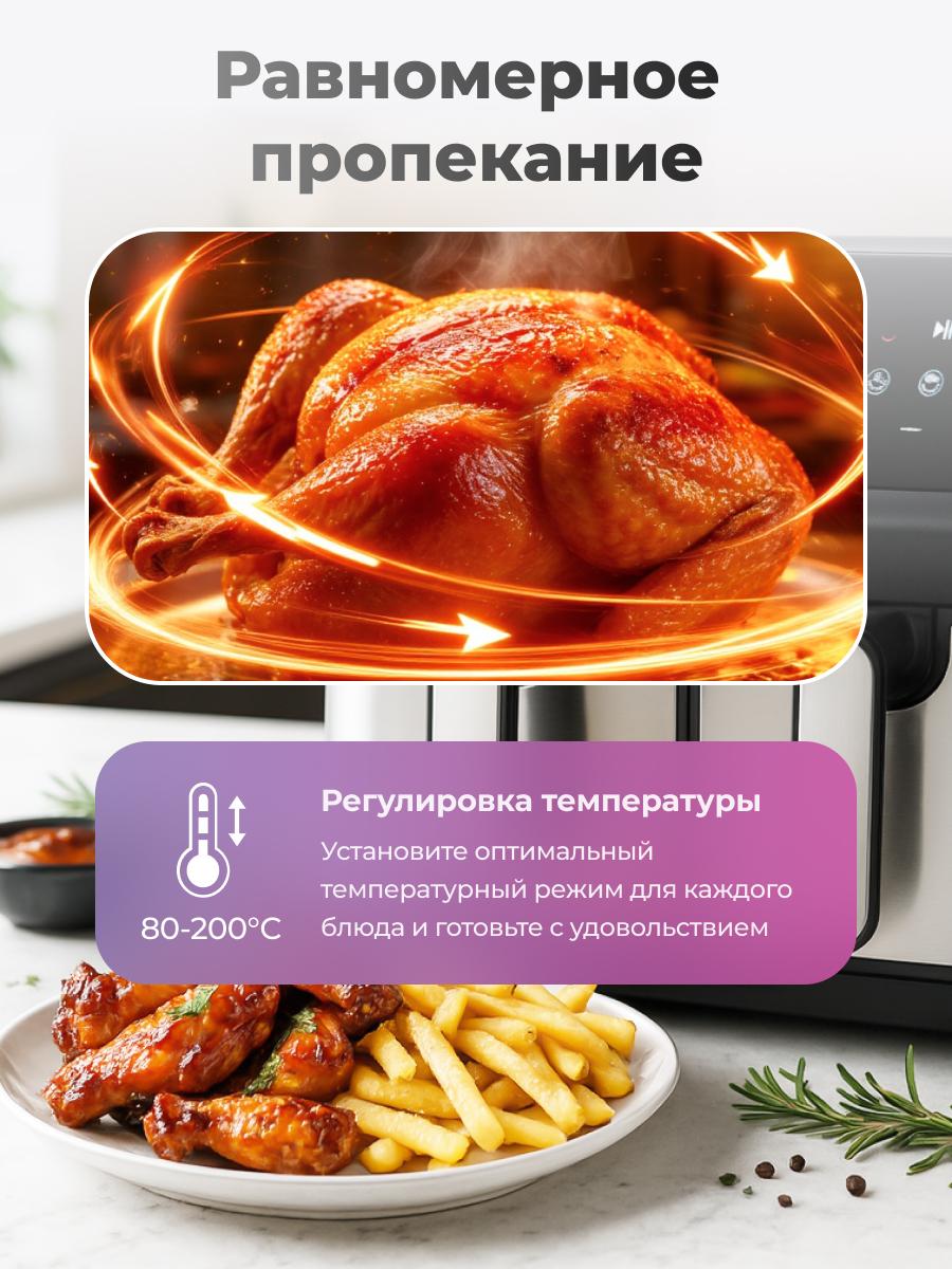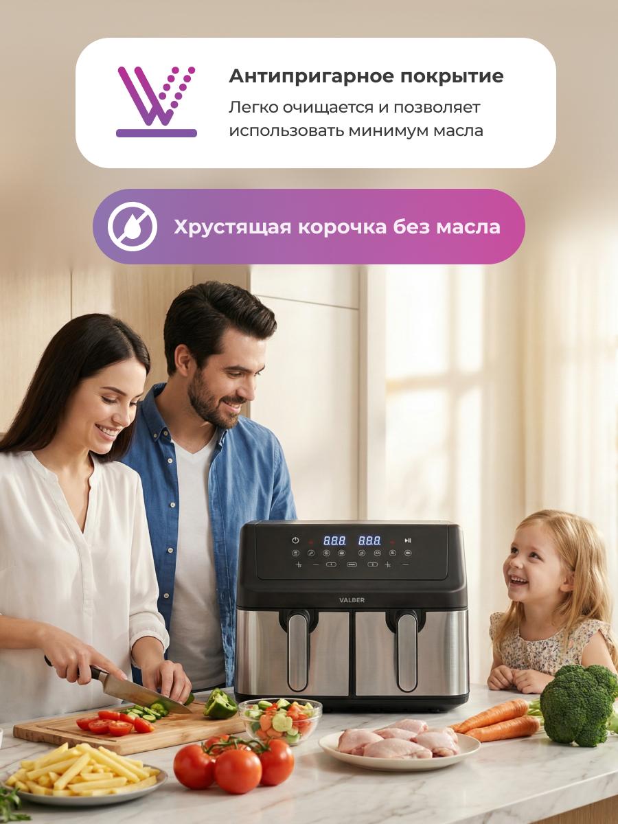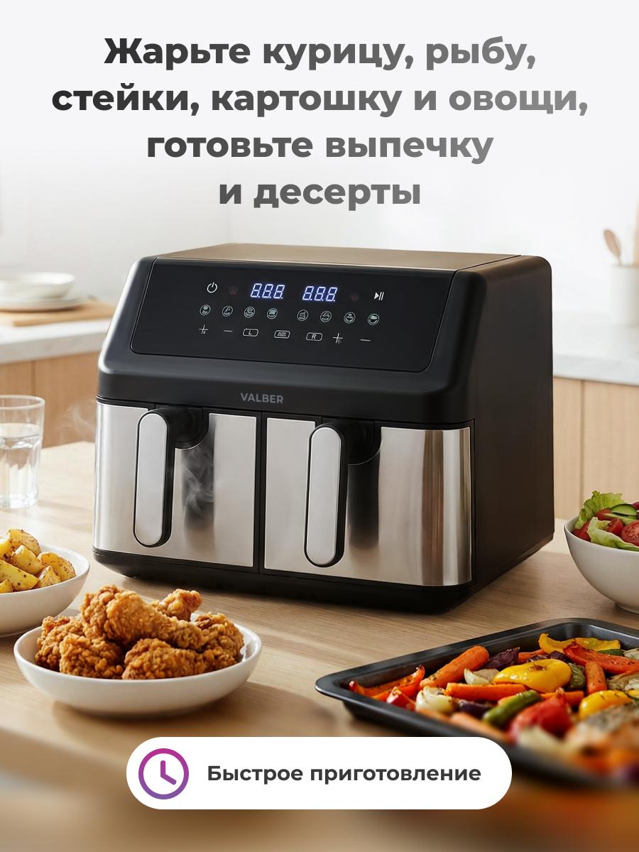 Аэрогриль AirChef Plus Dual V с двойной камерой 9 л (4,5+4,5) — двойная готовка, двойная экономия времени Откройте новые возможности кухни с мощным двухкамерным аэрогрилем: 2000 Вт, температура 80–200 °C и суммарный объём 9 литров (две независимые камеры по 4,5 л каждая) — идеален для одновременного приготовления разных блюд (383 × 287 × 331 мм приблизительно). Ключевые преимущества Повышенная мощность: 2000 Вт обеспечивает быстрее разогрев и ещё более равномерную корочку. Две независимые камеры: отдельное управление каждой кастрюлей — готовьте разные блюда одновременно без смешения запахов и настроек. Точный цифровой контроль: настройка температуры и времени с чрезвычайной точностью для каждого отсека. Практичные программы: 8 предустановленных режимов для повседневных рецептов — одно нажатие, и прибор делает остальное. Эффективная циркуляция воздуха: система быстрой циркуляции обеспечивает равномерное приготовление и экономит время. Безопасность и надёжность: автоматическое отключение по завершении, защита от перегрева. Лёгкий уход: антипригарное покрытие внутренних частей — быстро и просто мыть. Стабильность: нескользящие ножки удерживают прибор на месте во время работы. Кому подойдёт Семьям и парам, которые хотят готовить разные блюда одновременно. Тем, кто часто готовит для гостей или составляет комплексные меню. Пользователям, ценящим скорость, точность и удобство ухода. Технические данные Питание: 220–240 V ~ 50/60 Hz Мощность: 2000 Вт Температура: 80–200 °C Объём: 9 л (4,5 + 4,5 л) Размеры: приблизительно 383 × 287 × 331 мм